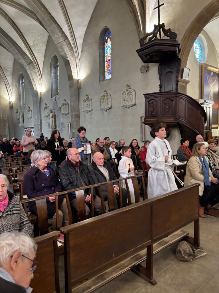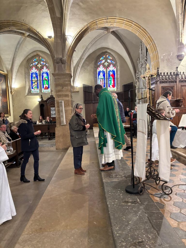 L’assemblée paroissiale nombreuse a été heureuse d’accompagner ses frères et sœurs en souffrance, s’unissant d’un seul cœur à la prière de l’église, heureuse aussi de retrouver son curé, le père Sylvain.