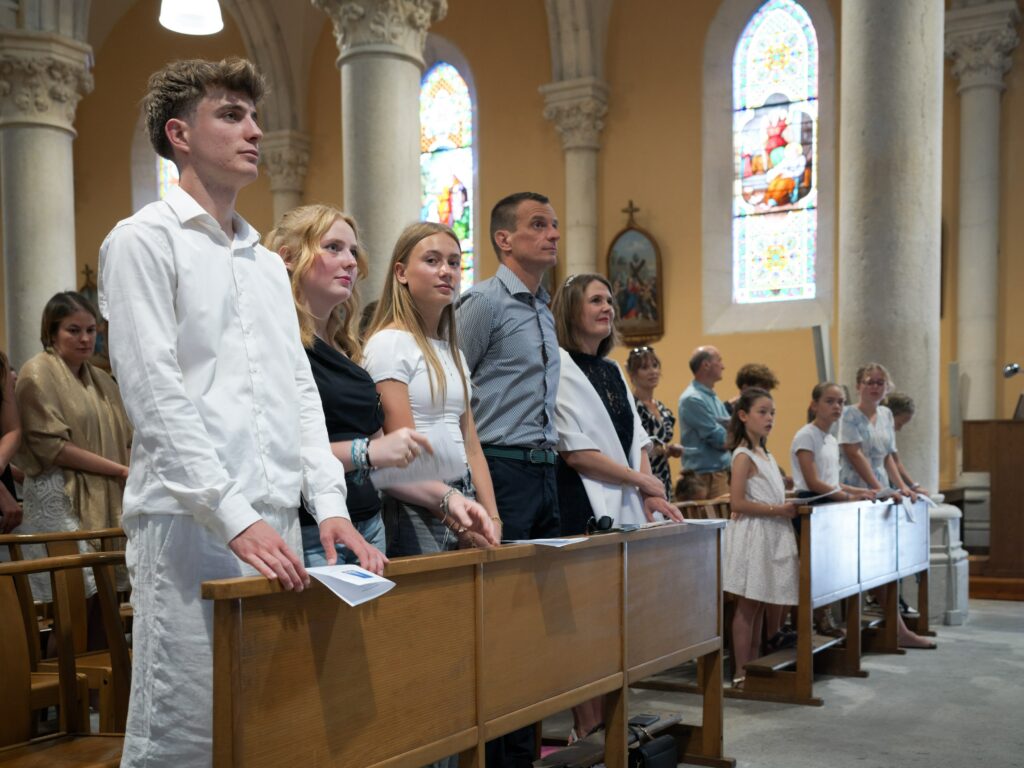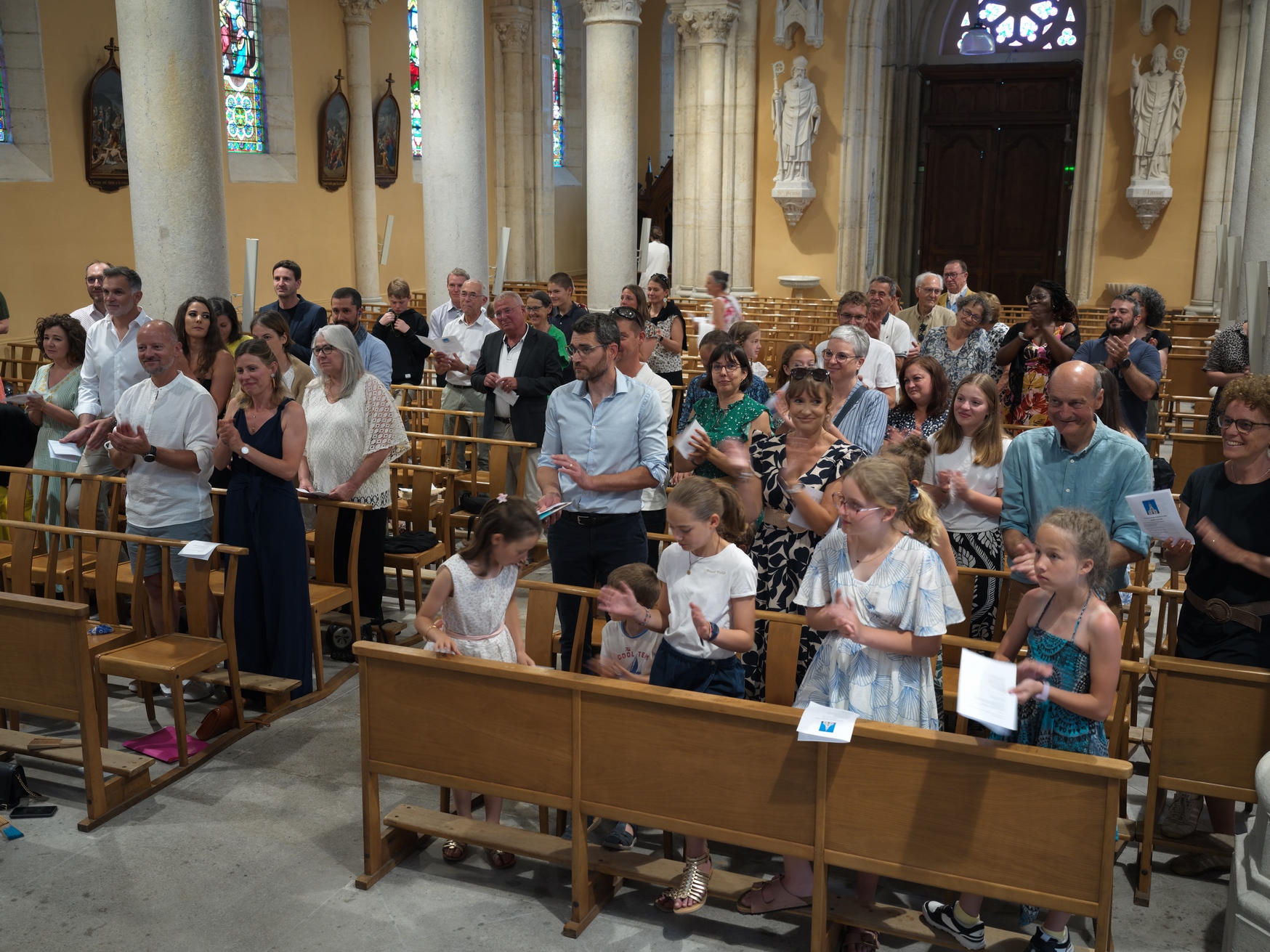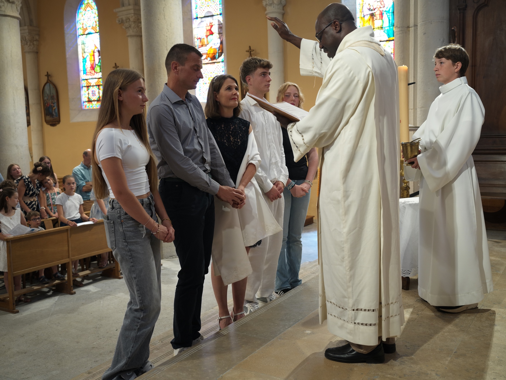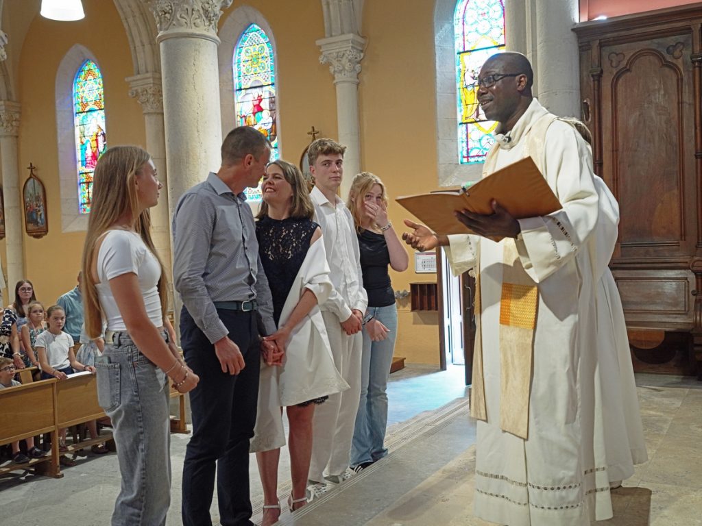 Valentine et Cédric, entourés de leurs trois enfants Arthur, Manon et Agathe, ont fêté leurs 20 ans de mariage d’abord par une bénédiction en l’église de Vernaison, puis avec une réception avec famille et amis. Le 31 mai 2025.